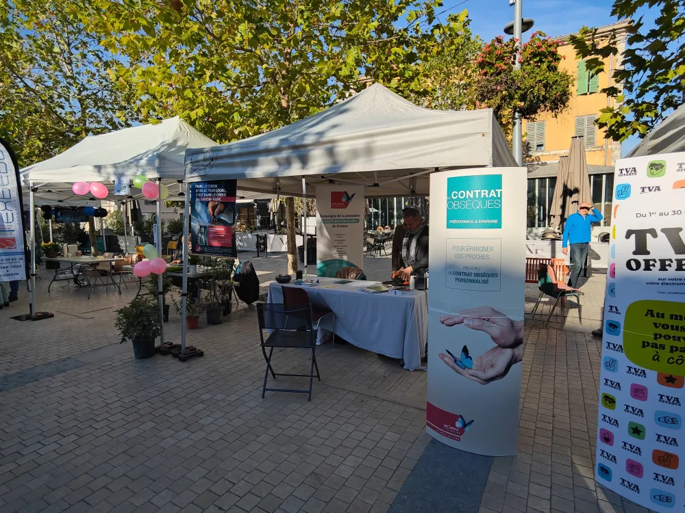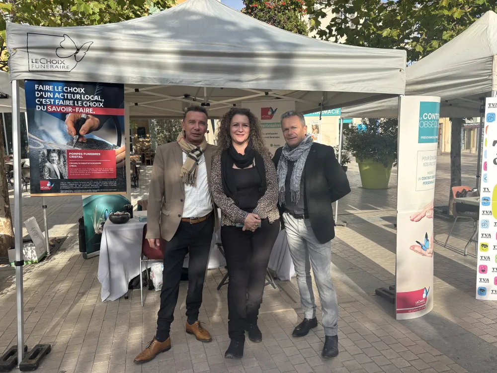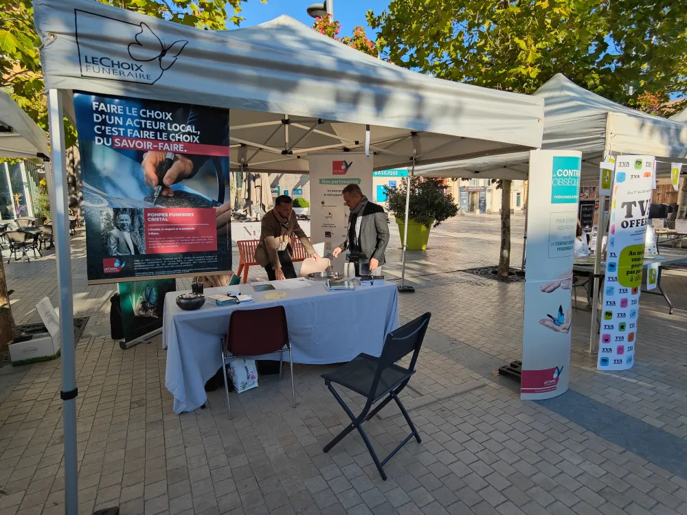 Ce samedi 27 septembre, l’équipe de Pompes Funèbres Cristal était présente au Forum des Pros de Saint-Maximin-la-Sainte-Baume. Aux côtés d'autres professionnels locaux, nous avons eu le plaisir d’échanger avec de nombreux visiteurs venus en apprendre davantage sur notre métier, souvent méconnu mais essentiel. Yvan, le gérant, ainsi que Cindy et Christian, ont pris le temps d’écouter, de répondre aux questions et de sensibiliser autour des services liés à la prévoyance obsèques.